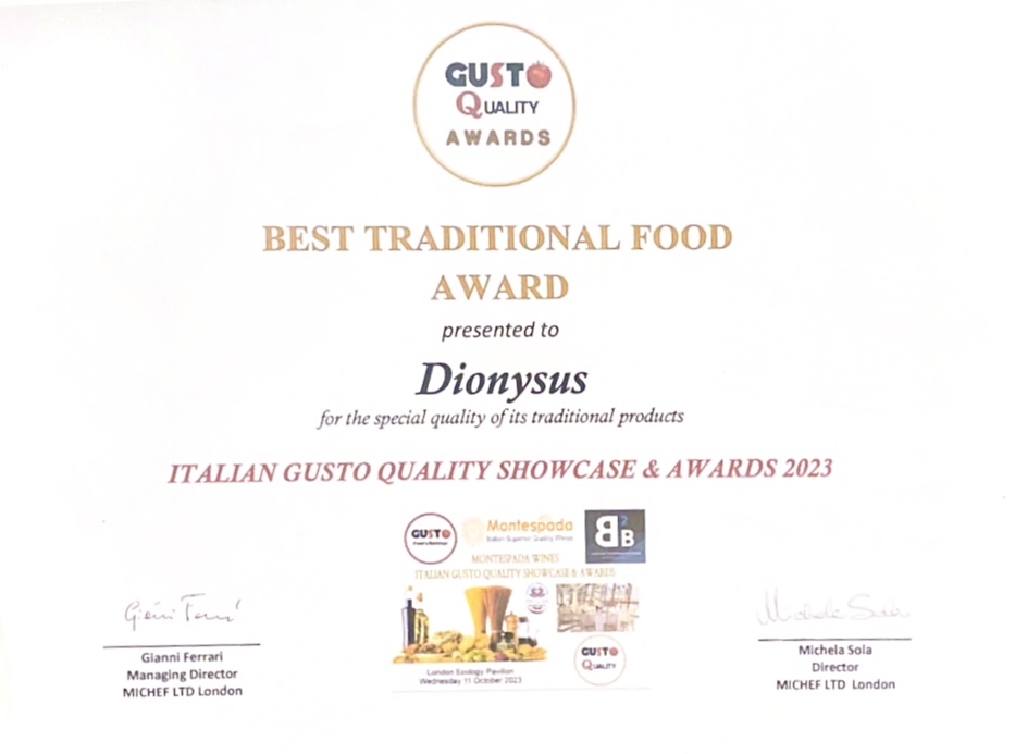 Dionysus won the “Best Traditional Food Award” at the Italian Gusto Quality Awards, for the special quality of its classic fine foods.